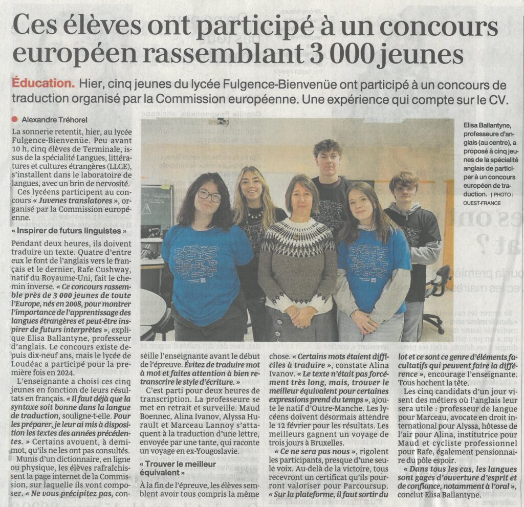 Ces élèves ont participé à un concours européen rassemblant 3000 jeunes. Ouest-France, 28 novembre 2025.