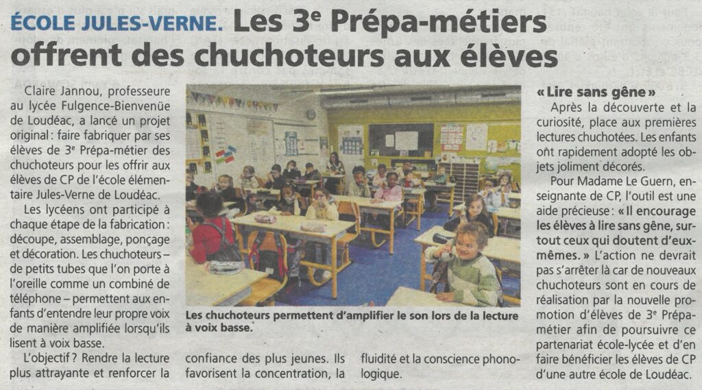 Ecole Jules-Verne. Les 3e Prépa-métiers offrent des chuchoteurs aux élèves. Le Courrier indépendant, 29 janvier 2026.