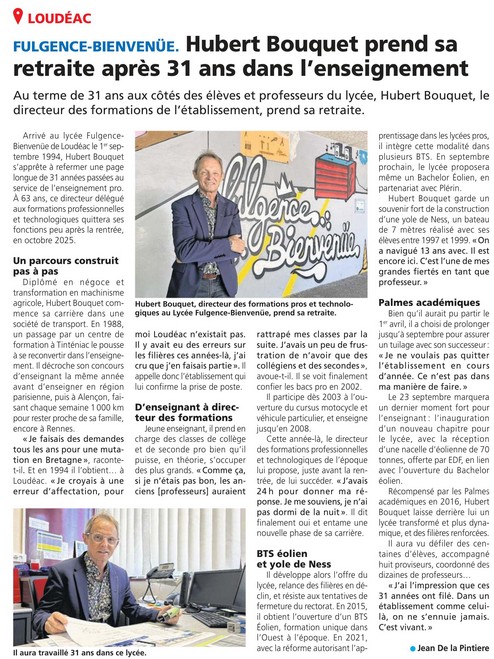 Fulgence-Bienvenüe. Hubert Bouquet prend sa retraite après 31 ans dans l’enseignement. Le Courrier indépendant, 17 juillet 2025.