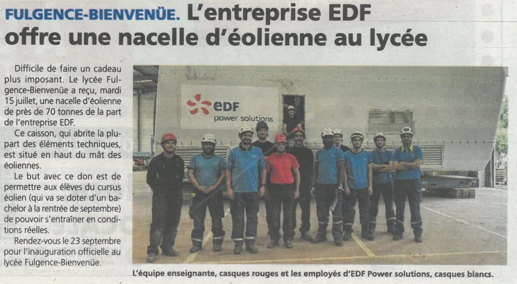 Fulgence-Bienvenüe. L’entreprise EDF offre une nacelle d’éolienne au lycée. Le Courrier indépendant, 24 juillet 2025.
